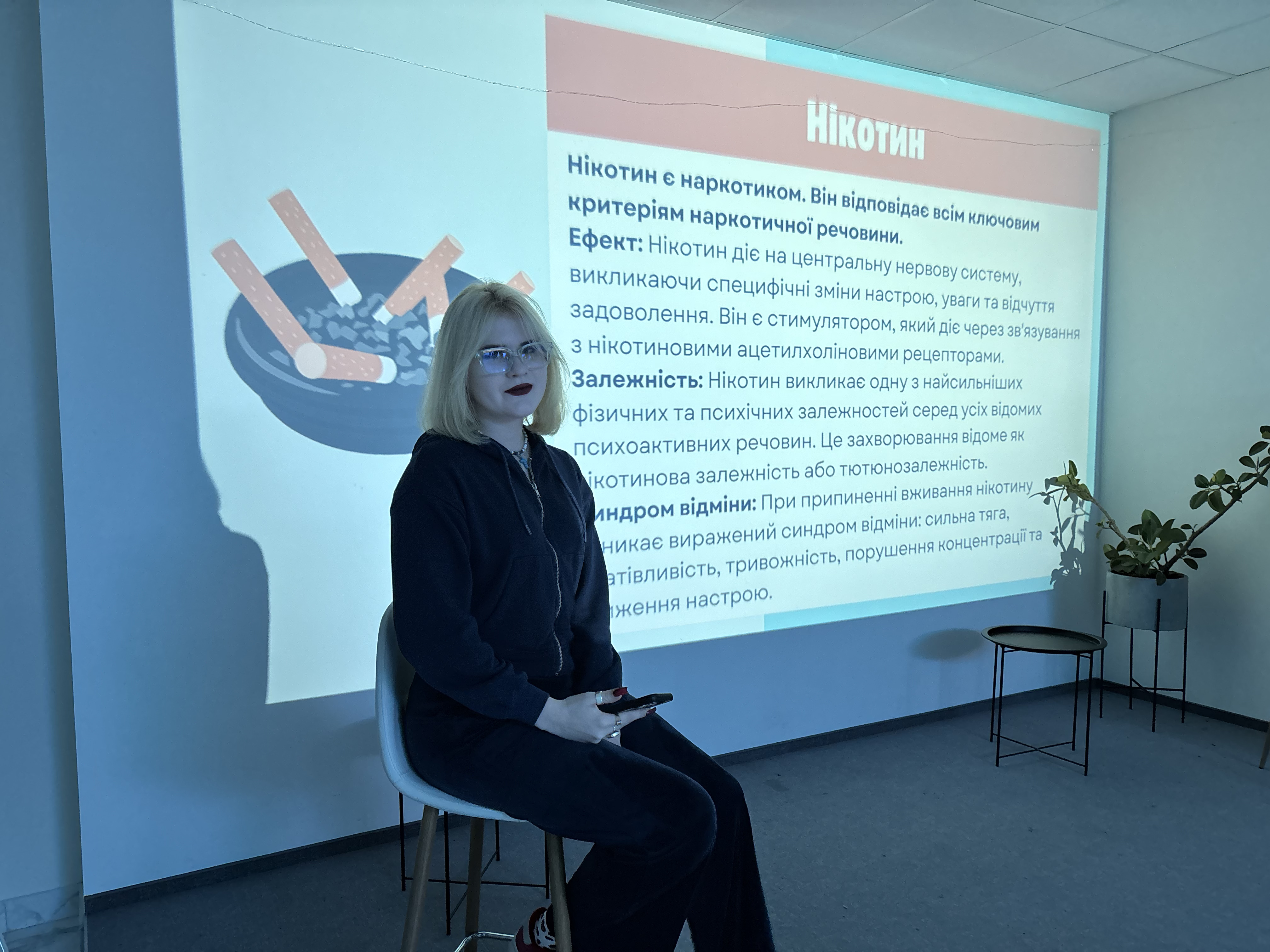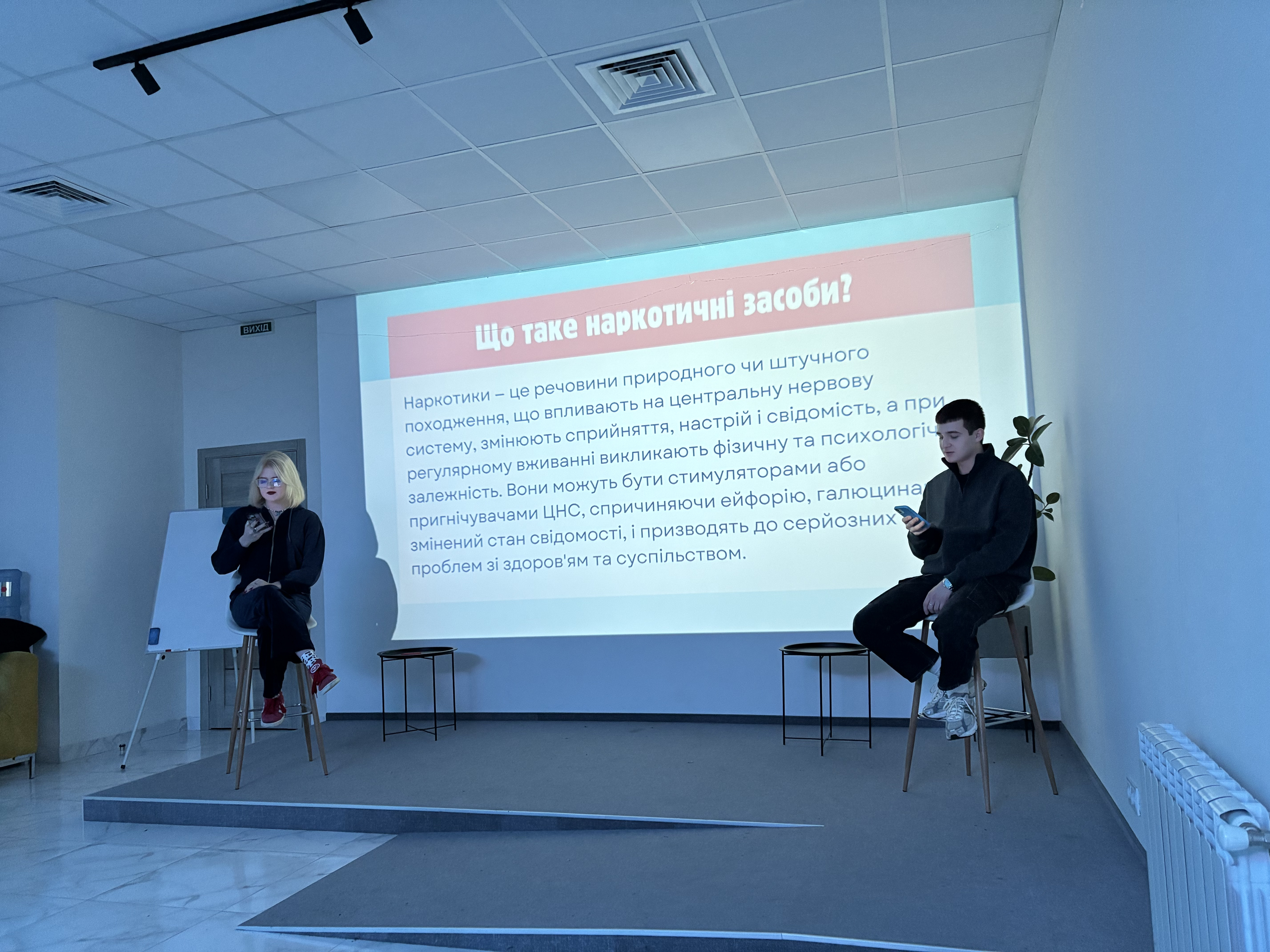 Розглянули класифікацію наркотичних засобів: від природних речовин до синтетичних препаратів, які сьогодні становлять одну з найбільших загроз для молоді. Студенти дізналися про їхній механізм дії, ризики швидкого формування залежності та коротко- й довгострокові наслідки для організму.