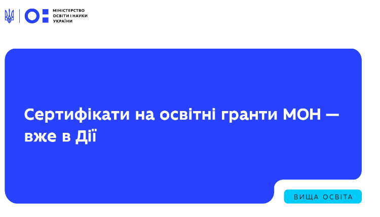 Від сьогодні, 24 вересня 2025 року, здобувачам вищої освіти 2025 року вступу почали надходити в застосунок Дія електронні сертифікати на освітні гранти. Підтвердження грантів триватиме до 25 жовтня. На початку жовтня гранти почнуть надходити й здобувачам минулого року вступу.