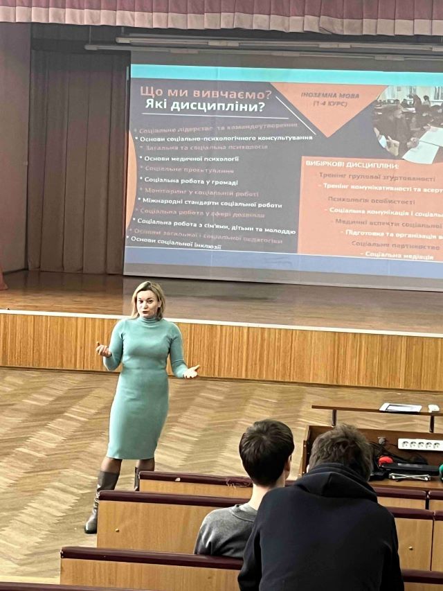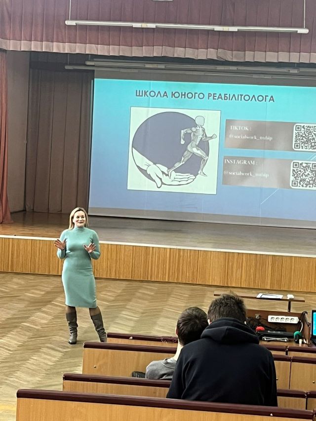 Бондаренко Наталія Олександрівна, доцент кафедри соціальної роботи та реабілітації, активно спілкувалась з учнями про проблеми, які на сьогодні викликані суспільством, адже те як ми сприймаємо зауваження та обставини- важливий показник і вміння співіснувати кожного члена у суспільстві. Наталія Олександрівна ознайомила з принципами та побудовами інклюзивної освіти, розвіяла найбільш популярні міфи стосовно соціальної роботи. Активно залучались до розмови не лише учні але і вчителі, вразив коментар вчителя, який повернувся з фронту і повідомив, що: «Суспільство не готове приймати тих, хто повертається, не завжди фізично і психологічно цілісно з фронту».