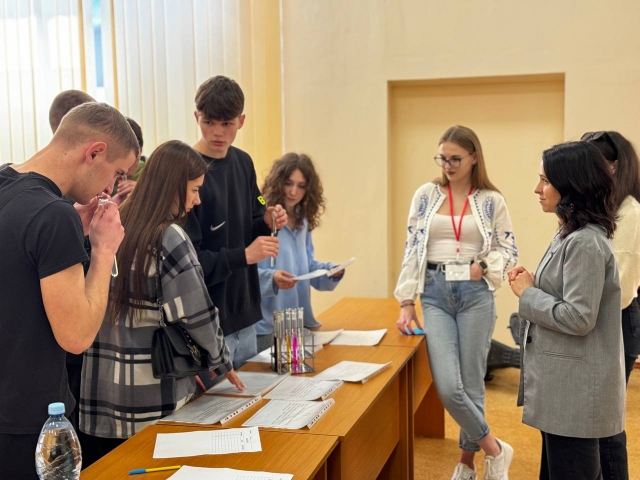 На другій локації викладачі з дисципліни «Паливно-мастильні матеріали» доцент кафедри Олександр ЛАВРІНЕНКО та асистент кафедри Наталія КУЛІБАБА підготували наочні матеріали з розмаїттям паливних і мастильних рідин, серед яких треба було розпізнати не тільки бензин чи дизель, а навіть нафту і окремі її складові.