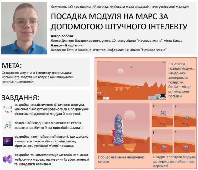Знайомтесь, Дмитро Лапко, учень 10 класу ліцею «Наукова зміна» міста Києва. На розгляд Всеукраїнського етапу молодий дослідник готовий представити результати власного дослідження на тему: «Посадка модуля на Марс за допомогою штучного інтелекту».