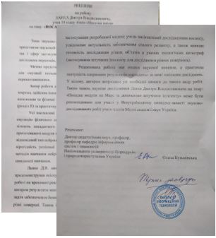 Слід зазначити, що крім вибору цікавої та актуальної теми Дмитро якісно виконав дослідження. Зокрема, спроектував та описав емуляцію фізичного двигуна, максимально оптимізованого для розрахунку зіткнень посадкового модуля і поверхні; визначив етапи посадки та здійснив їх декомпозицію; розробив і реалізував тип нейронної мережі, що швидко навчається і забезпечує високу вірогідність успішної м’якої посадки модуля; здійснив розробку та імплементацію методів навчання нейронних мереж, тестування їх ефективності та швидкості навчання.