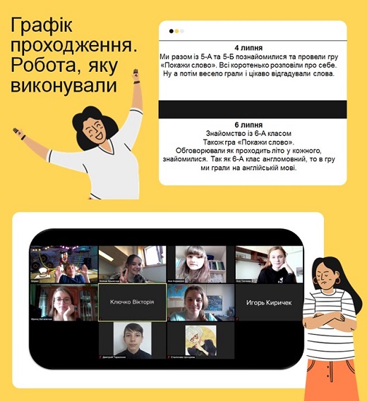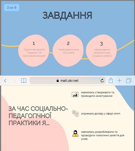 Зважаючи на дистанційну роботу більшості закладів освіти, студенти також проходили практику дистанційно. Але їхня практика проходила насичено із різноманітними завданнями від керівників практик, зустрічами на платформах та роботою з дітьми. Дарина Москаленко розповіла, що до початку проходження соціально-педагогічної практики мала можливість відвідати онлайн зустріч з Любов’ю Семенівною Лоріашвілі – представницею та психологинею Київського міського центру соціальних служб. Лекція була присвячена важливості сталого режиму дня та повсякденним ритуалам дитини. Темою обговорення також були підтримка дитини під час складних життєвих моментів та у стресових ситуаціях. Проговорили способи виявлення та допомоги дитині, що переживає/ла травмуючі події, а також про організацію літнього відпочинку за воєнного стану. Одним із перших завдань, яке отримала на початку практики від керівника бази практики, підготувати тренінгове заняття для учнів 8-9 класів «Скажемо «Ні!» негативним емоціям». Дарина розповіла детально в щоденнику як розробляла заняття-тренінг учнів з соціальним психологом/педагогом, темою якого постали такі питання як вплив негативних емоцій на людину та способи ефективної боротьби з ними.