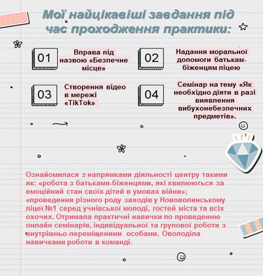 «Взагалі, моя практика дуже цікавою і цінною. Я відчувала себе справжнім соціальним працівником і мені було неймовірно комфортно працювати в таких умовах і з такими прекрасними людьми.
