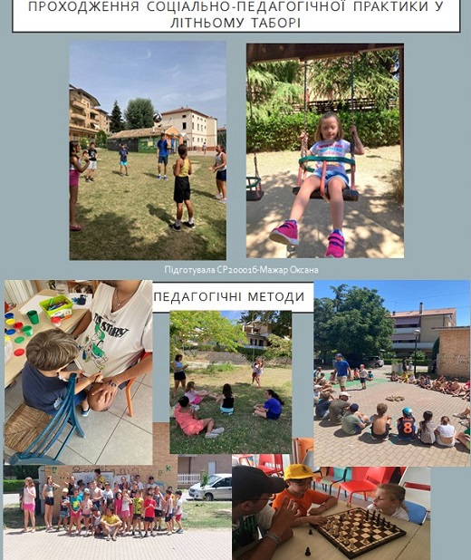 Варто також зазначити, що цьогорічну соціально-педагогічну практику студенти мали можливість проходити закордоном. Оскільки поки що не маючи можливості повернутись в Україну, студенти шукали можливість бути корисним і на відстані. Дмітрій Тимошенко, Олександр Краснодубець та Оксана Мажар поділились набутим практичним досвідом. Оксана проходила практику в літньому таборі в Італії. «Свою практику я проходила в місцевому таборі для дітей в місті Реканаті, де допомагала як волонтер. Моє завдання полягало у тому аби проводити час з дітьми, грати в різноманітні ігри - творчі, інтелектуальні, командні. Я була закріплена за конкретною категорією дітей, проте кожного тижня ми знімювали групи.