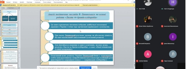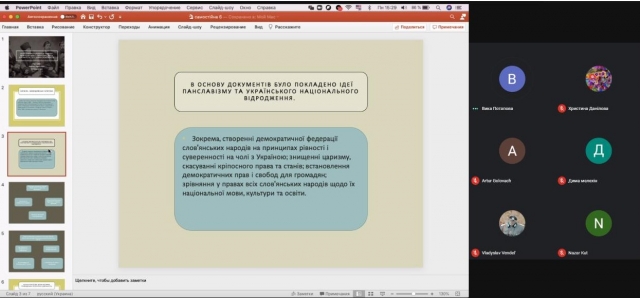 4 листопада 2020 р. відбулося чергове засідання гуртка з «Історії вчень про державу і право». Засідання відбувалося онлайн. Темами обговорення були "Політико-правові ідеї Вячеслава Липинського" та "Ідея панславізму в політичній у правовій думці України".