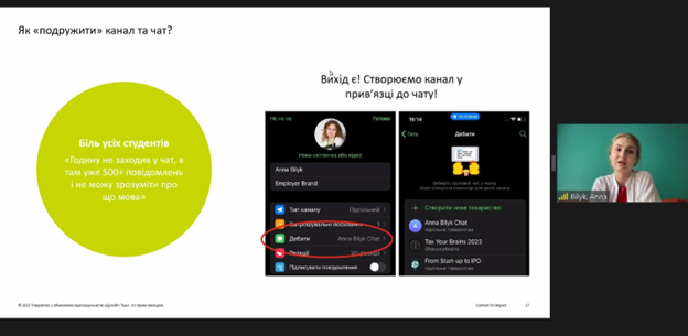 Тему: Телеграм-бот для автоматизації освітнього процесу розкрила спікер: Анна Білик, спеціалістка з розвитку бренду роботодавця, Deloitte Ukraine, також підготувала матеріал по слідкуючих направленнях: