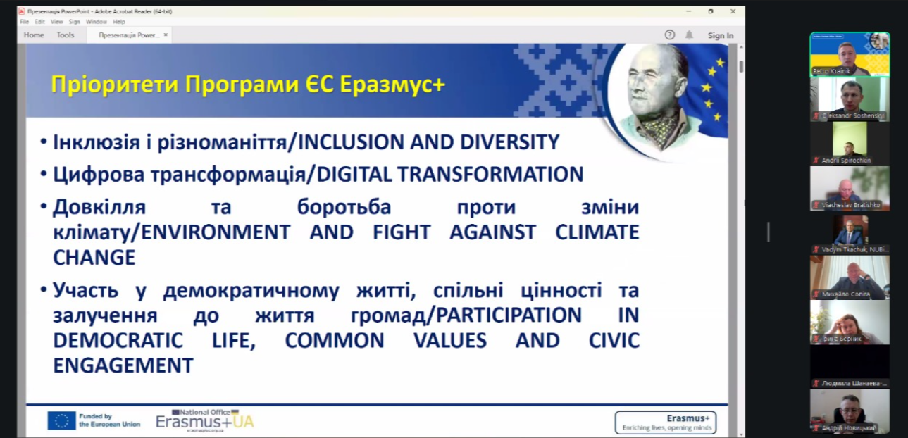 Координатор Національного Офісу Erasmus+ Петро Крайнік детально зупинився на критеріях оцінювання заявок Jean Monnet. Окрему увагу він приділив пріоритетам: інклюзії, цифровій трансформації, захисту довкілля, кібербезпеці та підтримці відновлення України.