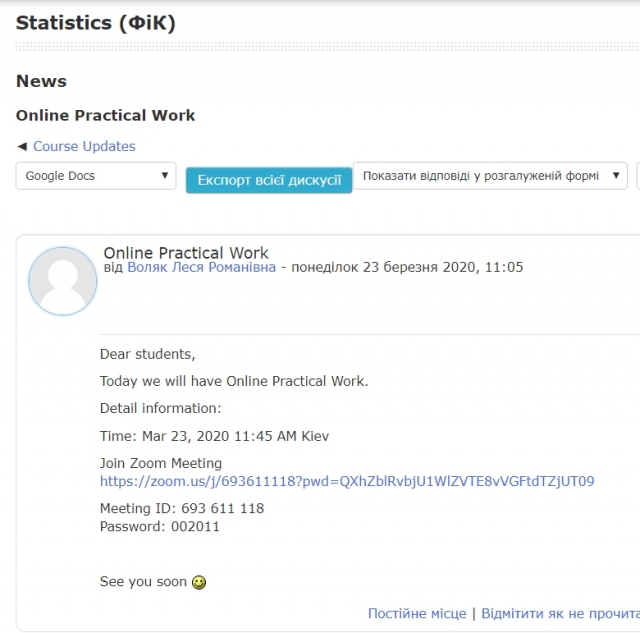 Попередньо на сайті Elearn було створено оголошення та всім студентам на пошту розіслано запрошення з активним посиланням доступу до відеоконференції.