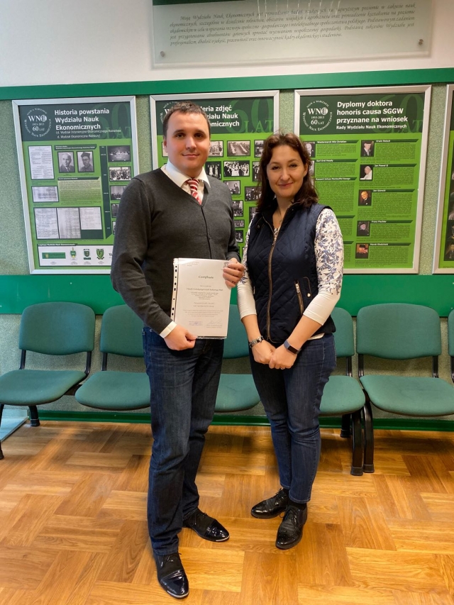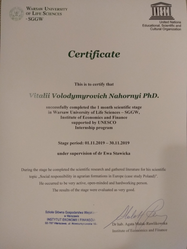 В рамках реалізації проекту Польського національного комітету у справах ЮНЕСКО доцент кафедри економіки праці та соціального розвитку, к.е.н. Нагорний Віталій Володимирович проходив наукове стажування тривалістю 1 місяць (01.11.-30.11.2019) у Варшавському університеті наук про життя (Warsaw University of Life Sciences – SGGW, Польща).