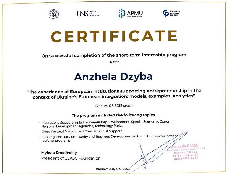 У період з 6 до 9 липня 2025 року завідувач Олена КОЛЕСНІЧЕНКО та доцент Анжела ДЗИБА кафедри ландшафтної архітектури та фітодизайну прийняли участь у закордонному стажуванні “Досвід європейських інституцій підтримки підприємництва в контексті європейської інтеграції України: моделі, приклади, аналітика” (м, Краків, Польща) для проектних менеджерів, щоб побачити як функціонують польські інституції оточення бізнесу, як розвиваються міжсекторні проекти, як Польща йшла шляхом від вступу ЄС до сьогодні і які перспективи в цьому контексті чекають на Україну.
