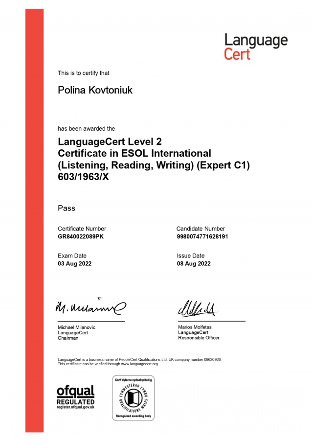Студентка 2-го курсу групи ФілА 21001б кафедри романо-германських мов і перекладу Поліна Ковтонюк цього літа успішно склала міжнародний іспит на володіння англійською мовою – LanguageCert International ESOL. LanguageCert International ESOL – це іспит з англійської мови, що перевіряє знання кандидата на обраному рівні CEFR (Common European Framework of Reference – Загальноєвропейські рекомендації з мовної освіти) в академічному контексті. Сертифікат, який видається після складання іспиту, визнається багатьма університетами та коледжами по всьому світу і є офіційним підтвердженням мовного рівня відповідно до стандартів Ofqual (The Office of Qualifications and Examinations Regulation – Управління регулювання кваліфікацій та іспитів, яке регулює кваліфікації, іспити та оцінювання в Англії).