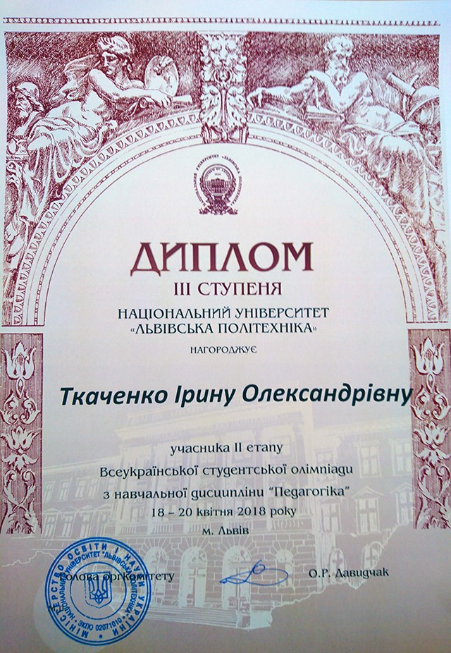 Кафедру соціальної педагогіки та інформаційних технологій в рсвіті гуманітарно-педагогічного факультету НУБіП України успішно представила студентка 4 курсу кафедри напряму підготовки «Соціальна педагогіка» Ткаченко Ірина. З-поміж 18 учасників із 9-ти закладів вищої освіти наша учасниця завоювала ІІІ місце і була нагороджена дипломом ІІІ ступеня та сертифікатом учасника олімпіади.