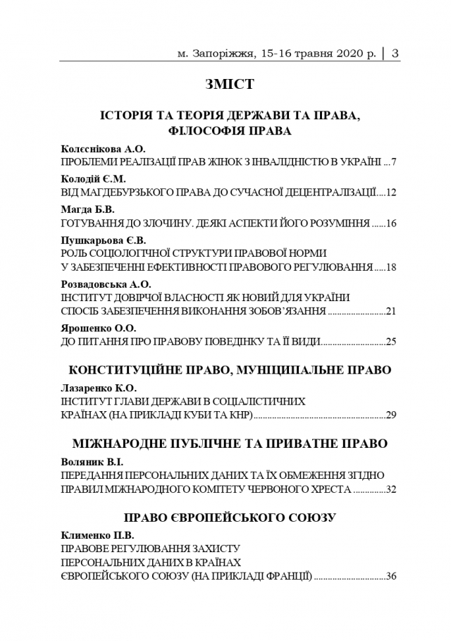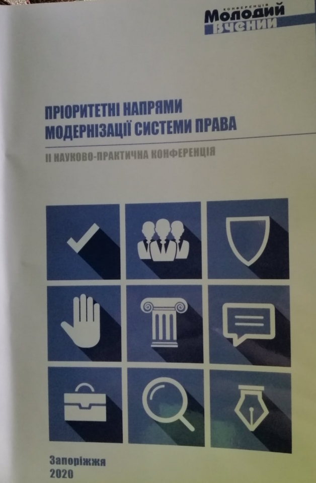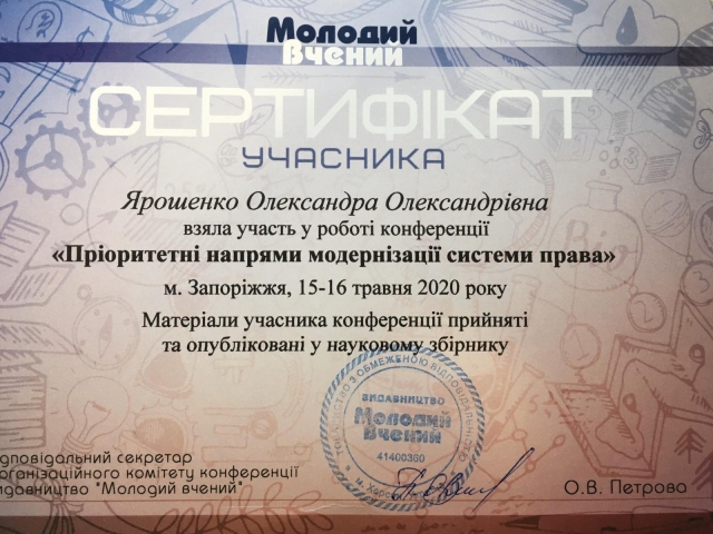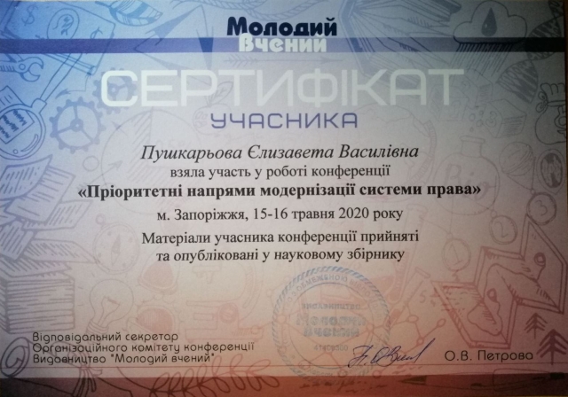 Паралельно Єлизавета Пушкарьова та Олександра Ярошенко представляли свої напрацювання на Міжнародній науково-практичній конференції «Пріоритетні напрями модернізації системи права» (м. Запоріжжя, 15-16 травня 2020 р.), організованій журналом «Молодий вчений». Юні науковці торкнулися питань ролі соціологічної структури правової норми у забезпеченні ефективності правового регулювання (Єлизавета Пушкарьова) та правової поведінки і її видів (Олександра Ярошенко).