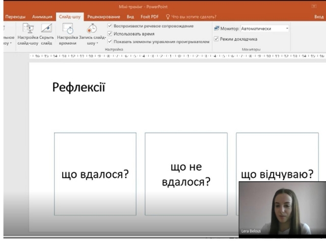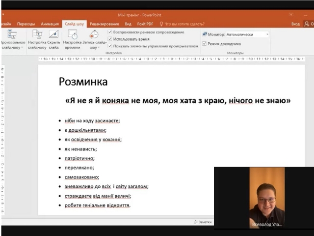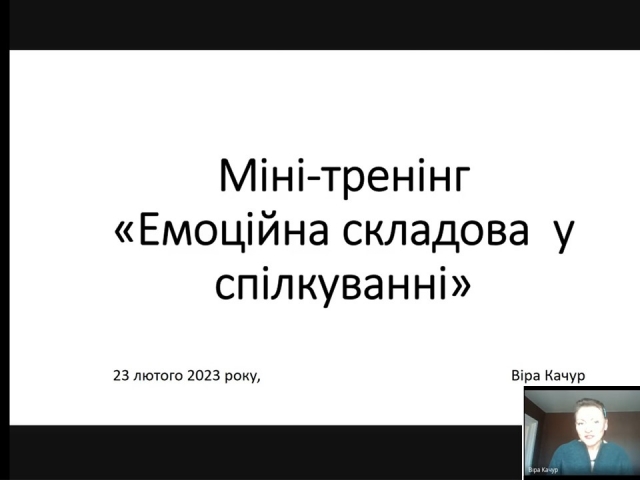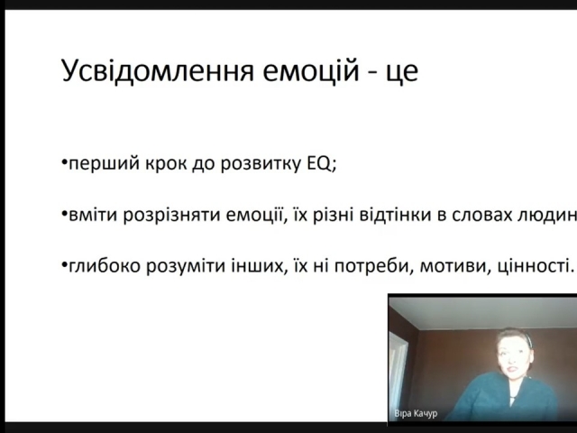 Потім перейшли безпосередньо до вправи «Прослуховування». Я з вимкненою камерою зачитувала 10 речень, кожне з яких відображало певний емоційний стан. Завданням учасників було кожну фразу означити відповідним емоційним смисловим підтекстом, який вони уловили. Потім ми звірили правильні відповіді, вони їх порахували, помножили на 10 і отримали свій результат.