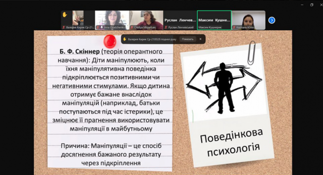 Рис. 1. Приклад презентації на тему «Причини та усунення маніпуляції дітьми батьків» на засіданні студентського наукового гуртка «Школа організатора соціально-психологічного простору особистості»