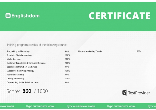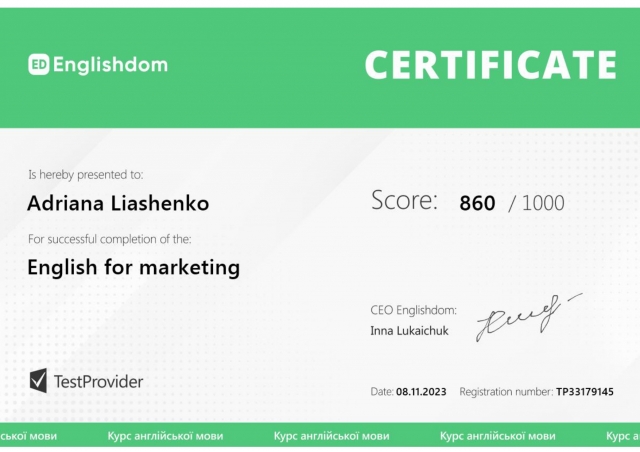 Студентка другого курсу спеціальності «Філологія» («Англійська мова та друга іноземна») Адріана Ляшенко не стала гаяти час під час зимових канікул та пройшла курс англійської мови English for Marketing, який був організований відомою онлайн-школою EnglishDom.