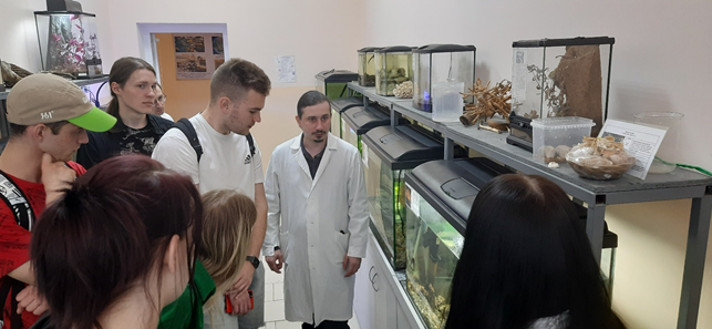 Під час екскурсії студенти мали можливість ознайомитися з акваріумним комплексом, який є основою навчально-дослідної бази лабораторії. У ньому утримуються представники різних видів риб, ракоподібних і безхребетних, що дозволяє спостерігати за їх поведінкою, годівлею, розмноженням та реакцією на зміну умов середовища.