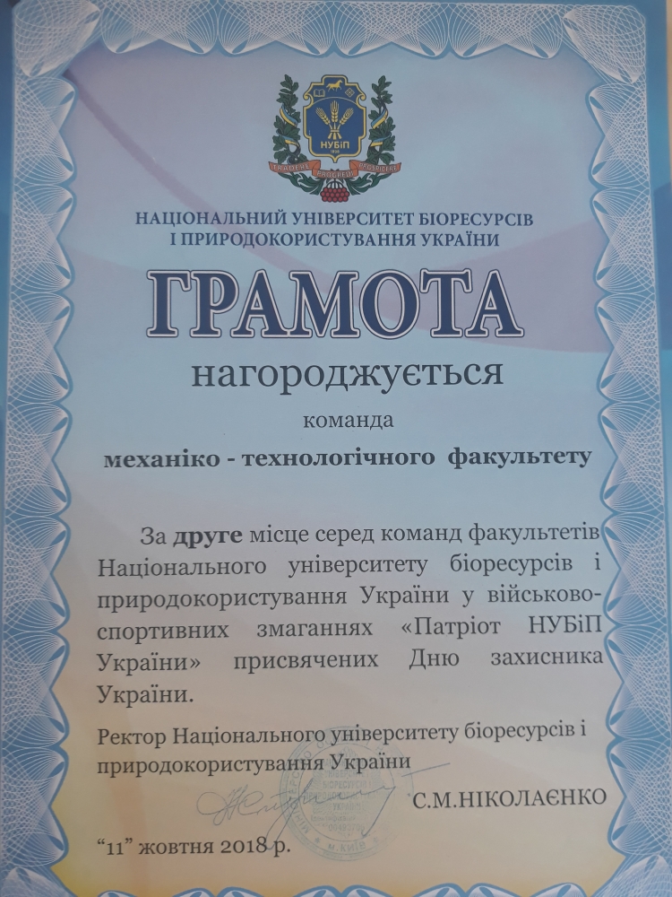 Студенти механіко-технологічного факультету вибороли друге місце у військово-спортивних змаганнях «Патріот НУБіП України», присвячені Дню захисника України. Перше місце виборола команда агробіологів , третіми стали представники факультету конструювання та дизайну.