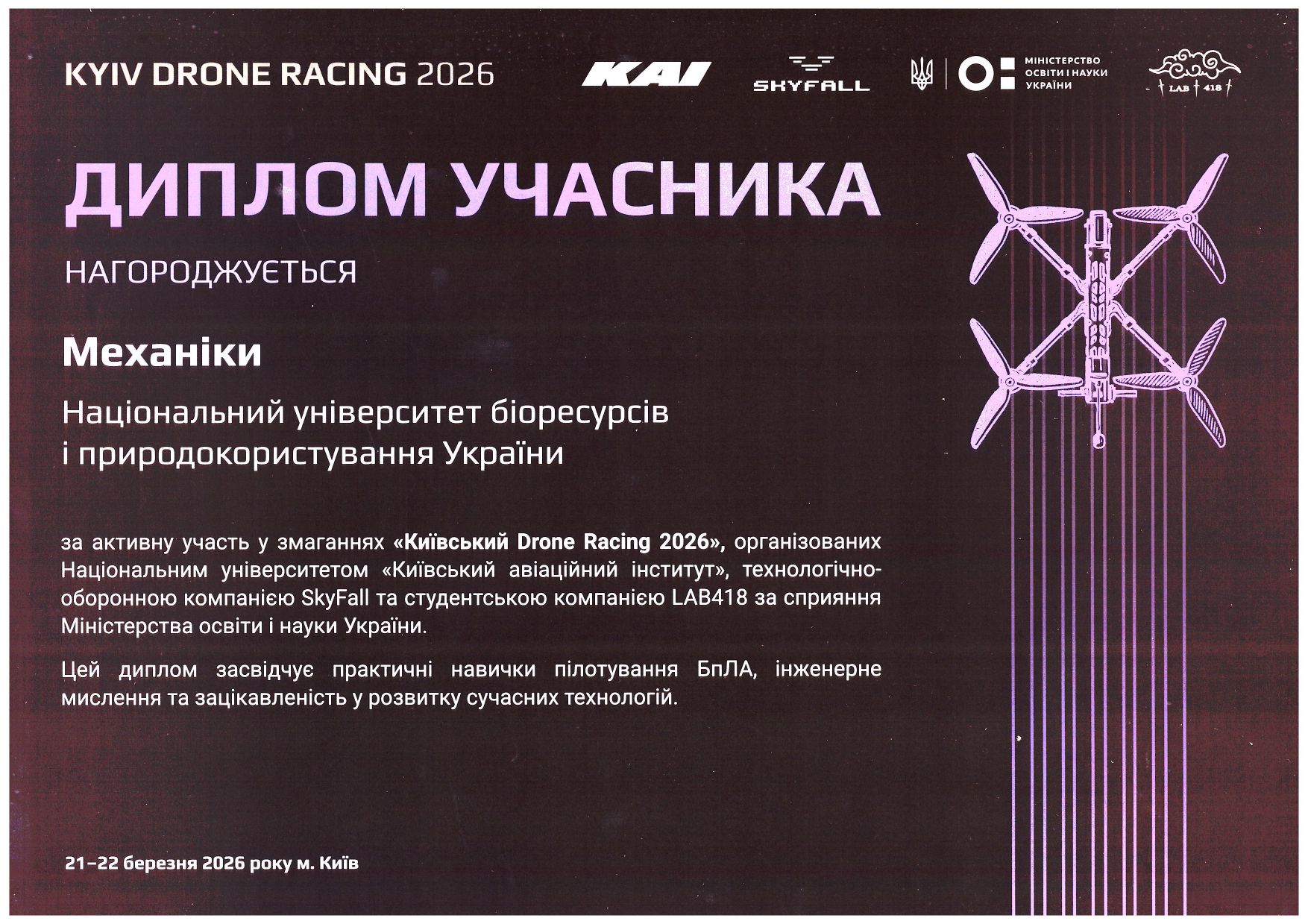 За підсумками змагань команда «Механіки» отримала Диплом учасника, який засвідчує високі практичні навички пілотування БПЛА, інженерне мислення та залученість до розвитку сучасних технологій.
