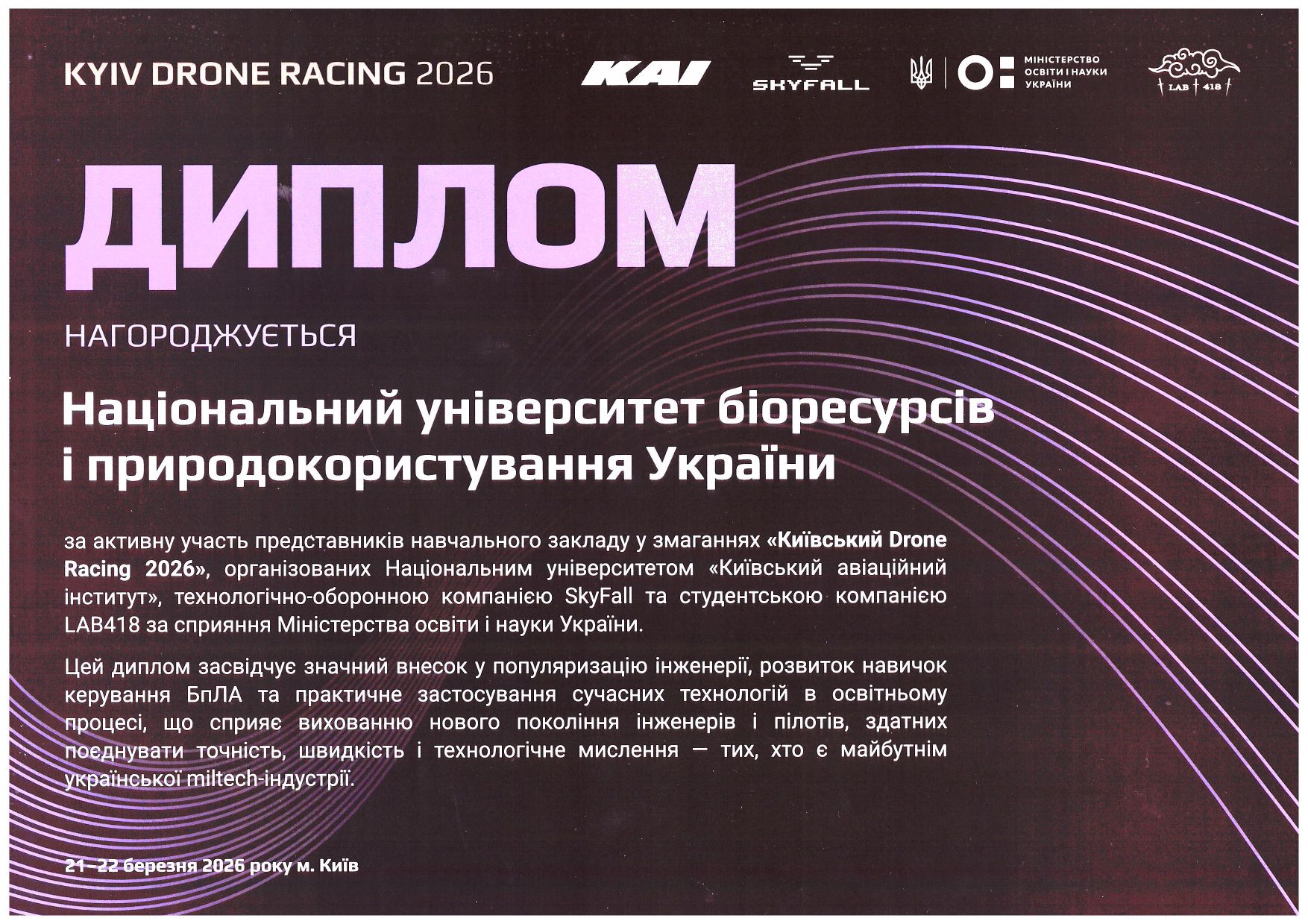21-22 березня 2026 року в місті Києві відбулися масштабні змагання з FPV-перегонів серед молоді «Київський Drone Racing 2026». Захід об’єднав студентів вищих та професійних навчальних закладів столиці задля популяризації сучасних технологій та розвитку навичок пілотування БПЛА. Організаторами змагань, які проходили за сприяння Міністерства освіти і науки України виступили Національний університет «Київський авіаційний інститут», технологічно-оборонна компанія SkyFall та студентська компанія LAB418.