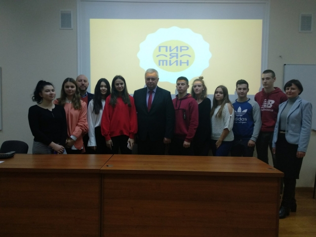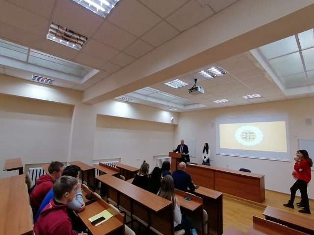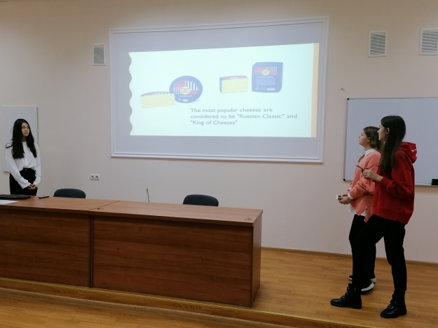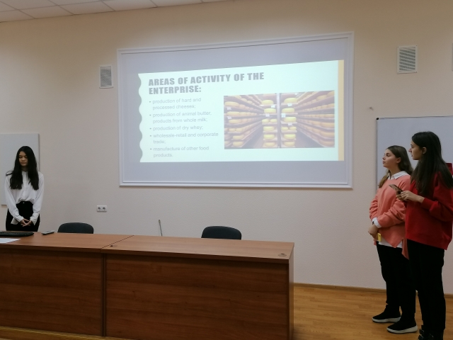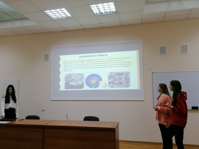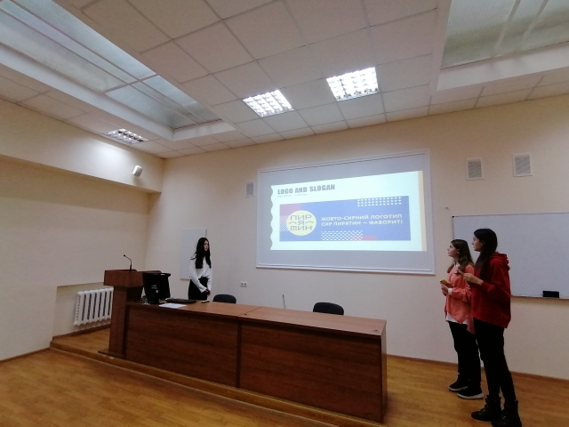 Потім преставниці групи Єлизавета Лі, Ангеліна Брижата та Марія Усок успішно провели англомовну презентацію, у якій висвітлили особливості діяльності Пирятинського сирзаводу, фактори, які сприяли його успіху на ринку та результати аналізу комплексу маркетингу підприємства.