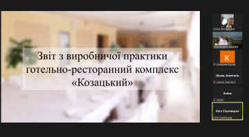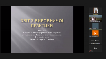 На семінарі за результатами проходження виробничої практики, який проходив у режимі онлайн, студенти з ентузіазмом захищати звіти, ділитись досвідом проходження виробничої практики, надавали свої пропозиції щодо покращення організації роботи на підприємствах. Під час захисту студенти Швень Анастасія, Бурчак Катерина, Коновал Антоніна, Ковальова Анна, Сябренко Аміна, Шевченко Анастасія, Ульяницька Катерина, Гаврилюк Ілля, Міхєєва Дарина, Яковенко Вікторія та інші змістовно відповідали на поставлені запитання стосовно основних моментів проходження виробничої практики. Не зважаючи на ситуацію в країні, студенти сумлінно навчаються і вносять свій вклад в розвиток економіки сфери гостинності.