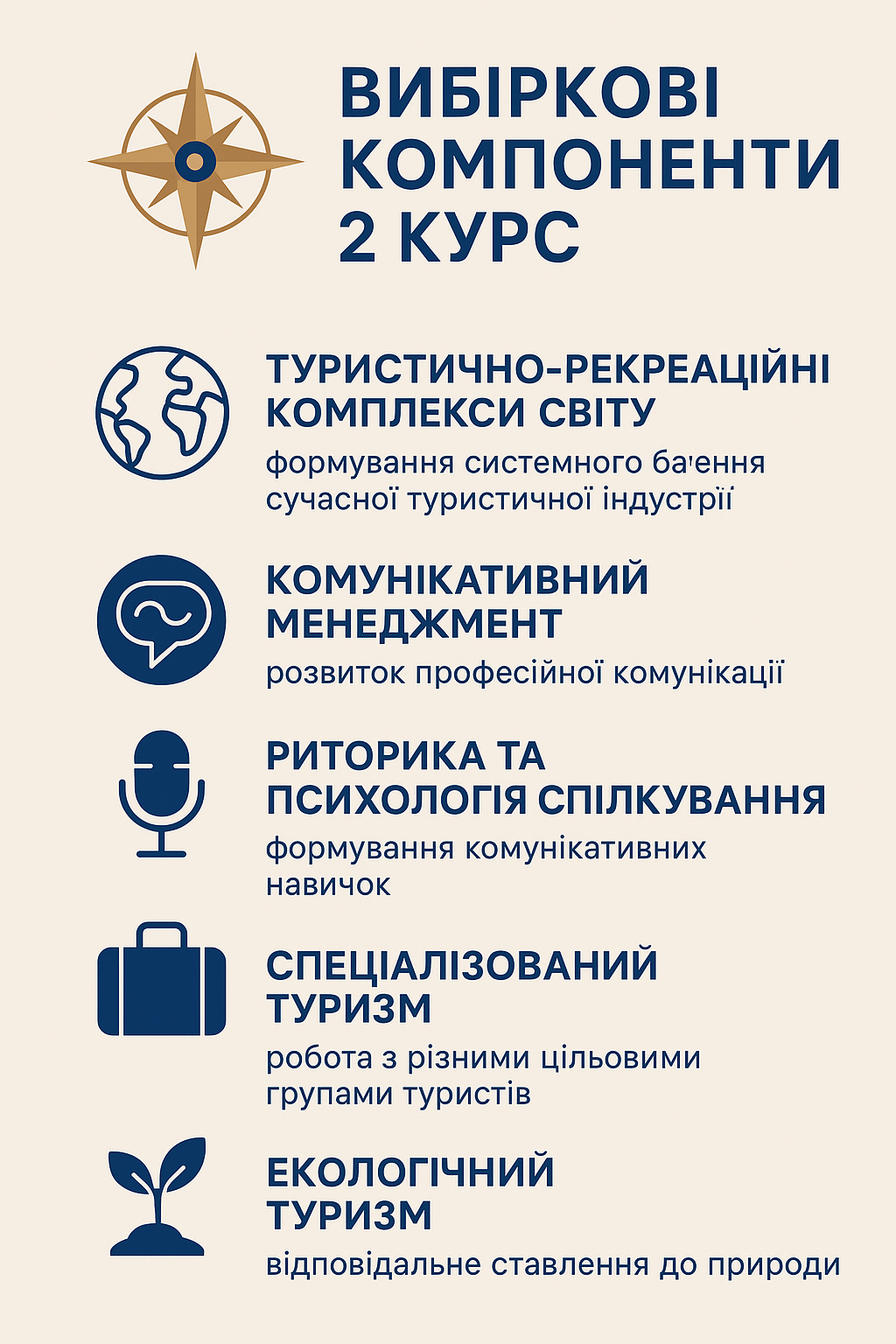 Здобувачі другого курсу обирали дисципліни на п’ятий і шостий семестр з-поміж таких, як «Туристично-рекреаційні комплекси світу», «Комунікативний менеджмент», «Риторика та психологія спілкування», «Спеціалізований туризм» та «Екологічний туризм», що забезпечують формування системного бачення сучасної туристичної індустрії та сприяють розвитку професійної комунікації, критичного мислення, уміння працювати з різними цільовими групами туристів, а також виховують відповідальне ставлення до природного середовища.