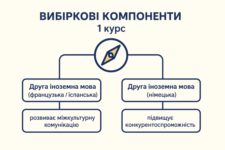 Першокурсники визначалися між варіантами освітніх компонент «Друга іноземна мова (французька/іспанська) або «Друга іноземна мова (німецька)», які спрямовані на розвиток комунікативної культури, міжкультурної взаємодії та професійної мобільності майбутніх фахівців. Вивчення другої іноземної мови поглиблює розуміння культурних особливостей різних країн, формує навички ділового спілкування в міжнародному середовищі та розширює можливості працевлаштування на глобальному туристичному ринку.
