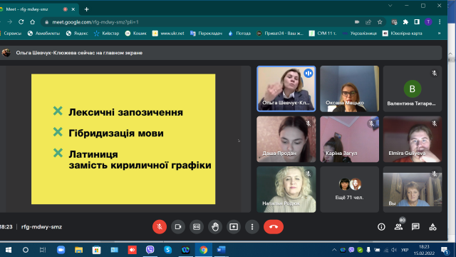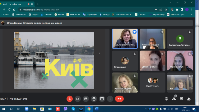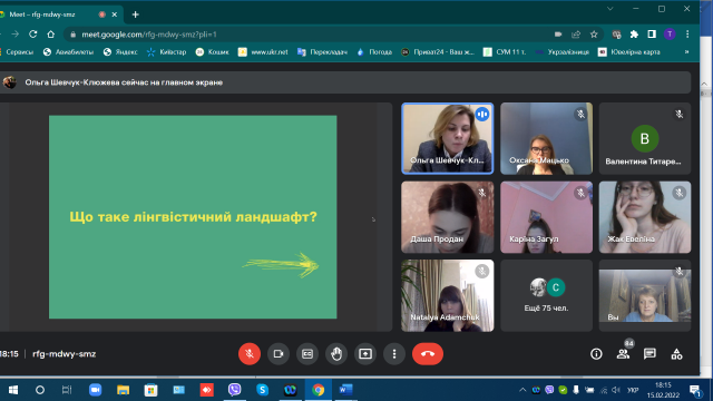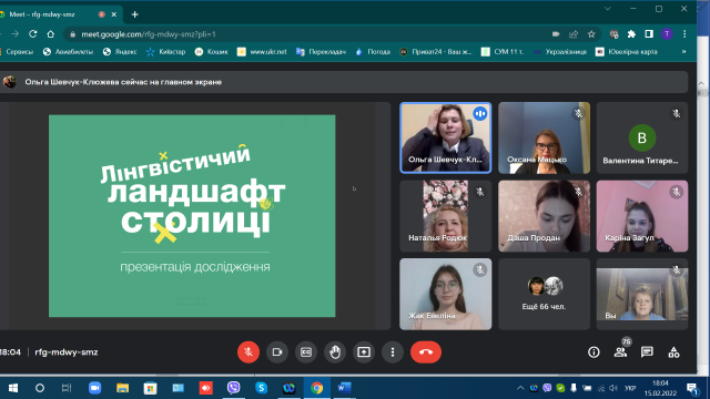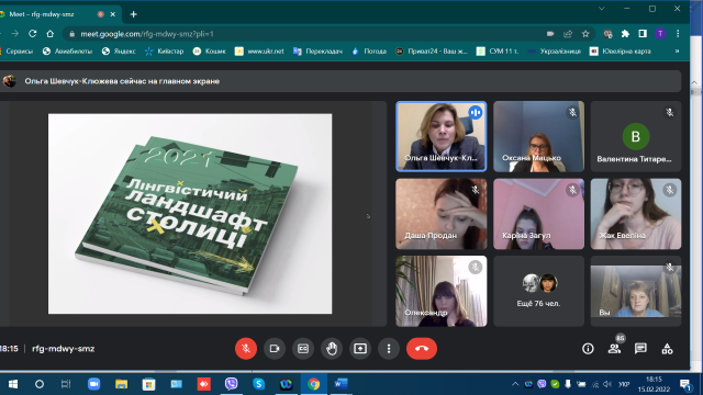 Так, 15 лютого 2022 р. викладачі та студенти спеціальності «Журналістика» мали нагоду взяти участь у засіданні лінгвістичного клубу «ЗМовники» Інституту філології Київського національного університету імені Тараса Шевченка. Зауважимо, що сумісні заходи студентів двох базових закладів вищої освіти України стали вже традиційними і відбуваються на постійній основі. Ця зустріч об’єднала учасників навколо надважливої теми «Лінгвістичний ландшафт столиці України».