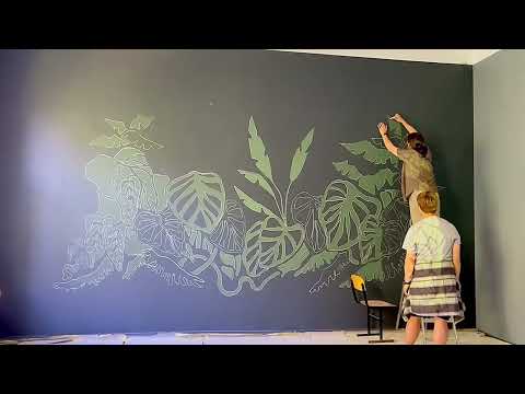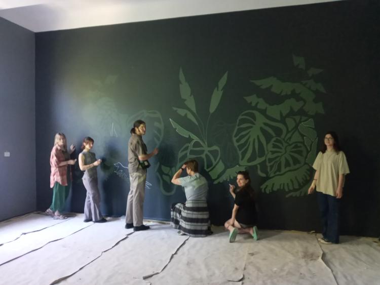 У 59 навчальній аудиторії кафедри ландшафтної архітектури та фітодизайну НУБіП України з’явилося нове яскраве панно! — стінний малюнок із тропічними мотивами та стилізованими елементами листків монстери. Над його створенням активно працювали студенти 3 курсу та скороченого терміну спеціальності «Садово-паркове господарство».