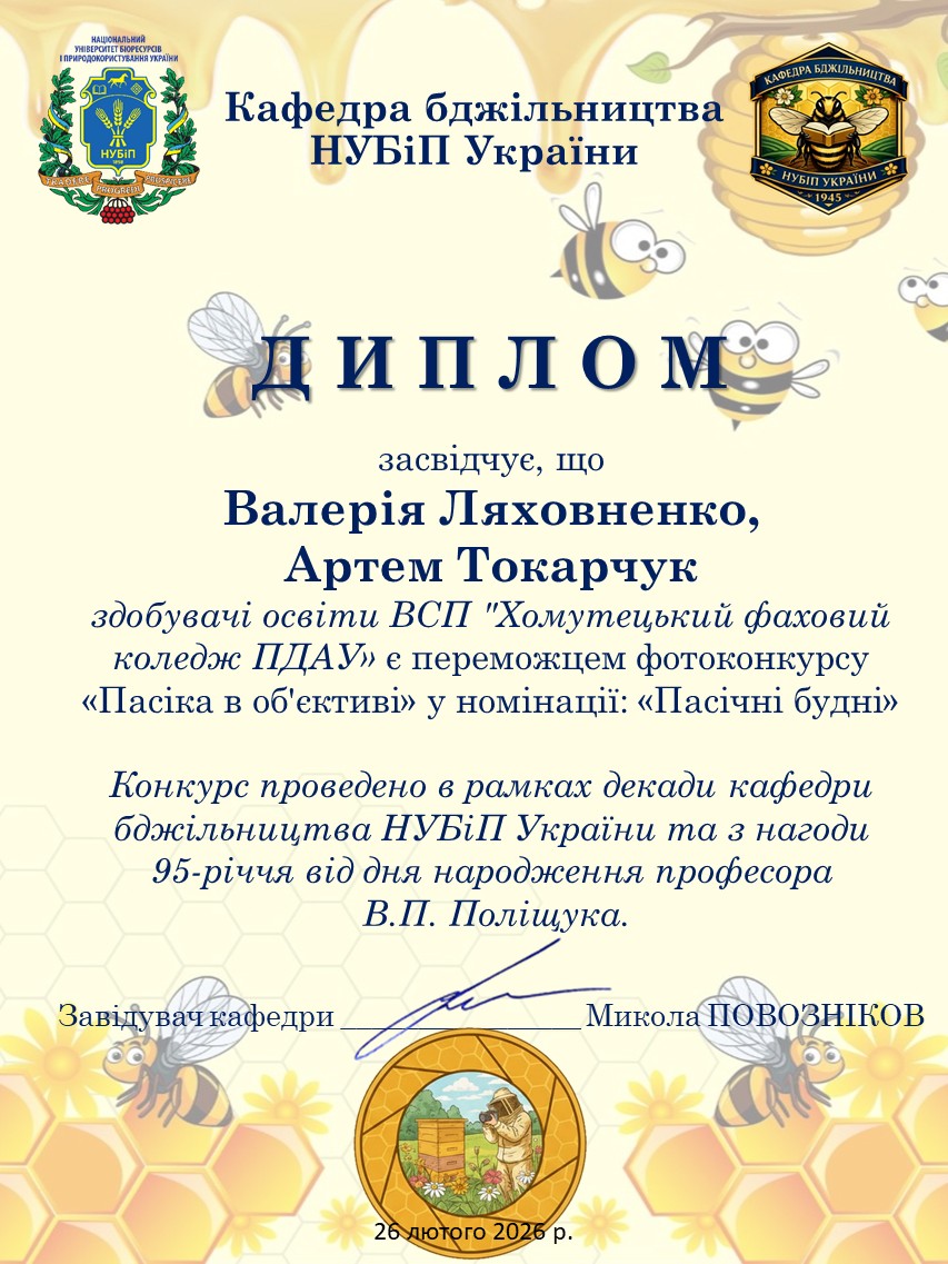 🏆 Номінація «Пасічницькі будні» — Тріумф Хомутецького фахового коледжу ПДАУ Перше місце у цій номінації виборола світлина під назвою «Майбутні бджолярі», надіслана студентами ВСП «Хомутецький фаховий коледж Полтавського державного аграрного університету». На знімку, зробленому в лабораторії коледжу, зафіксовано момент фахового наставництва: студентка 4 курсу Валерія Ляховенко знайомить першокурсника Артема Токарчука з основами дисципліни «Технологія виробництва продукції бджільництва». Автором цього вдалого кадру став заступник директора з навчально-виховної роботи коледжу Михайло Литвиненко. Ця робота стала символом передачі знань та важливості підготовки молодих спеціалістів.