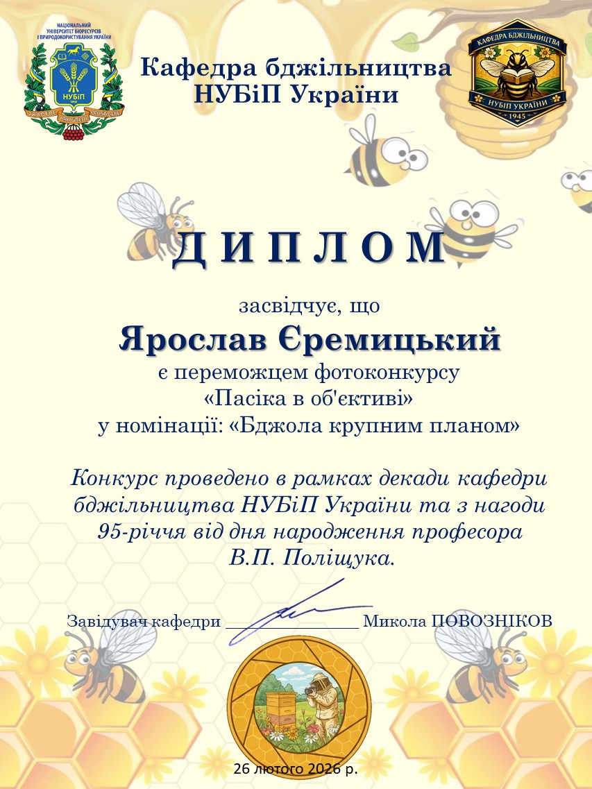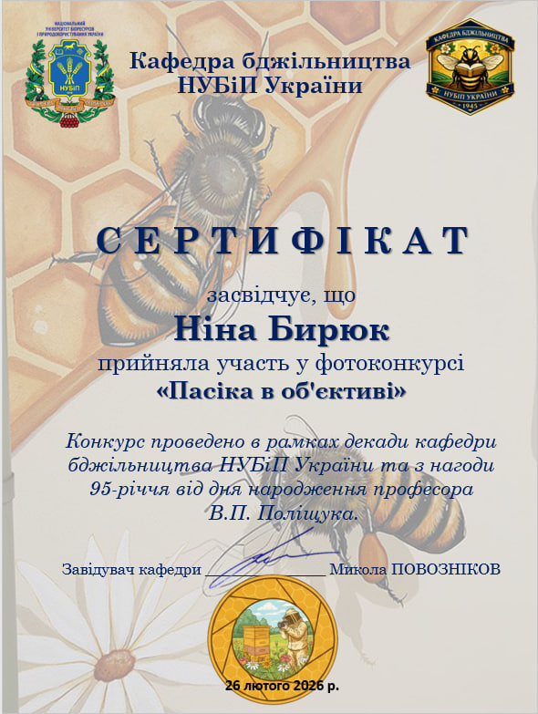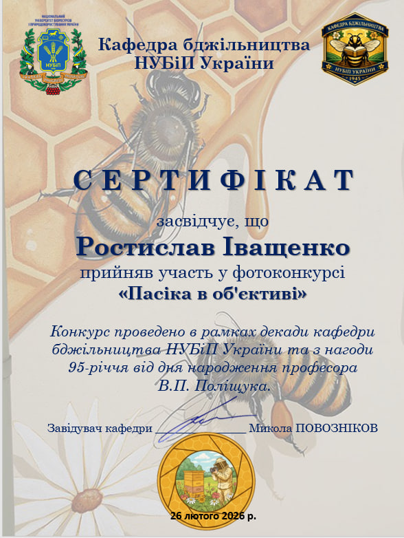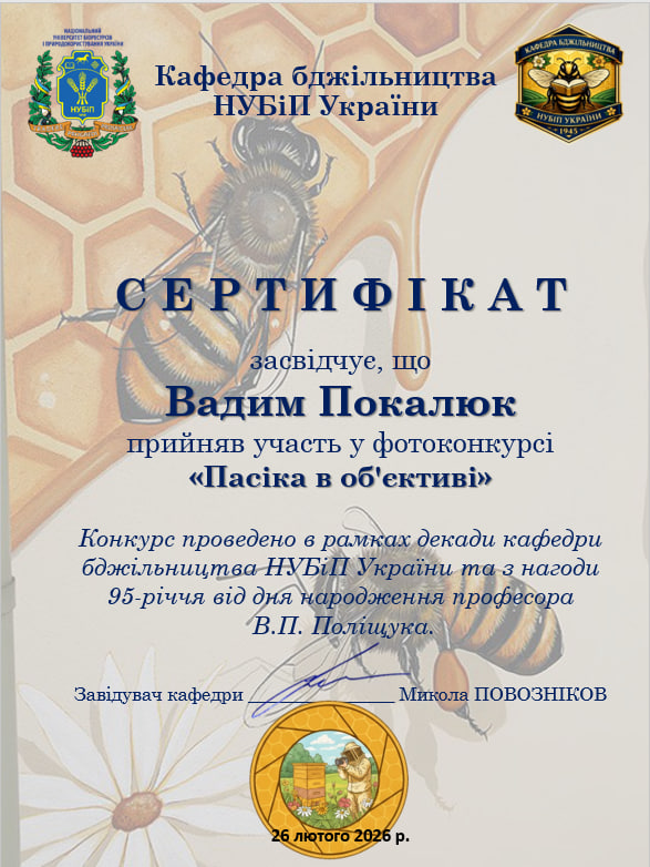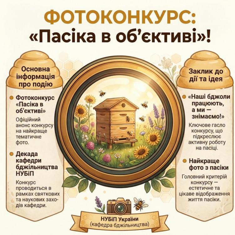 У рамках Декади кафедри бджільництва НУБіП України відбулася знакова творча подія — фотоконкурс «Пасіка в об’єктиві». Конкурс, присвячений пам’яті видатного вченого, професора Віктора Петровича Поліщука, став не просто змаганням, а справжнім святом, що об’єднало студентство нашого університету та колег із провідних аграрних закладів освіти України.