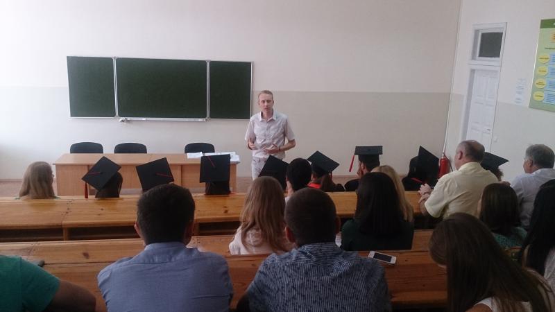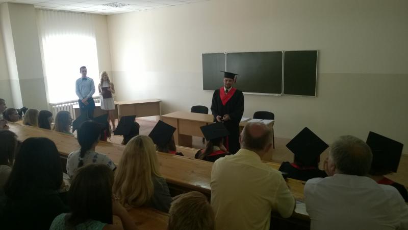 У рідних для них стінах пролунав гімн України, гімн студентів Gaudeamus, звучали урочисті слова. До дипломованих бакалаврів та магістрів звернувся декан факультету, професор Шинкарук В. Д., який висловив впевненість, що серед присутніх молодих людей є майбутні кандидати та доктори наук, доценти та професори, успішні освітяни, керівники науково-методичних центрів і департаментів. Він закликав не губити зв’язок з викладачами, наставниками, впевнено та мужньо крокувати вперед.