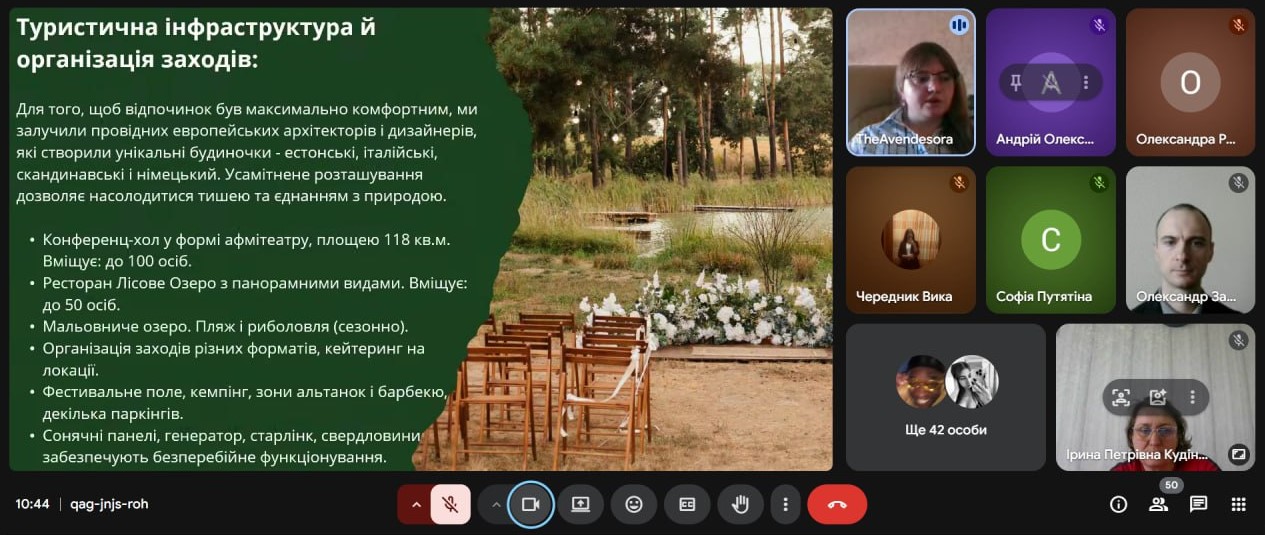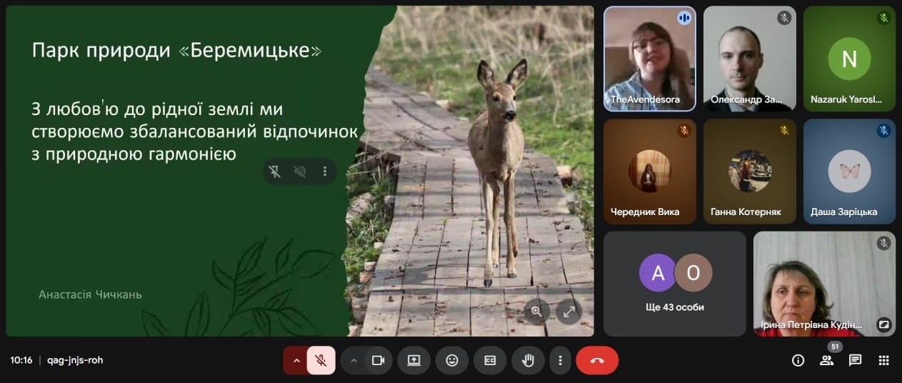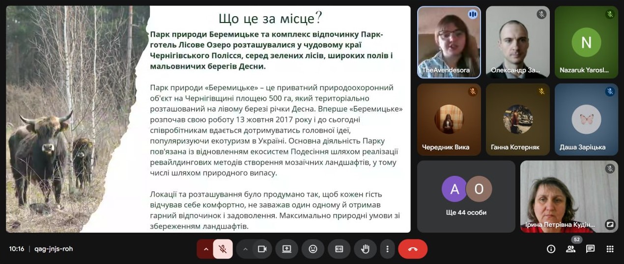 На лекції були розкриті цікаві та актуальні питання, пов’язані з проблеми розвитку українського екотуризму у реаліях війни, а також з особливостями технології ревайлдингу та досвідом парку «Беремицьке» у відновленні дикої природи.