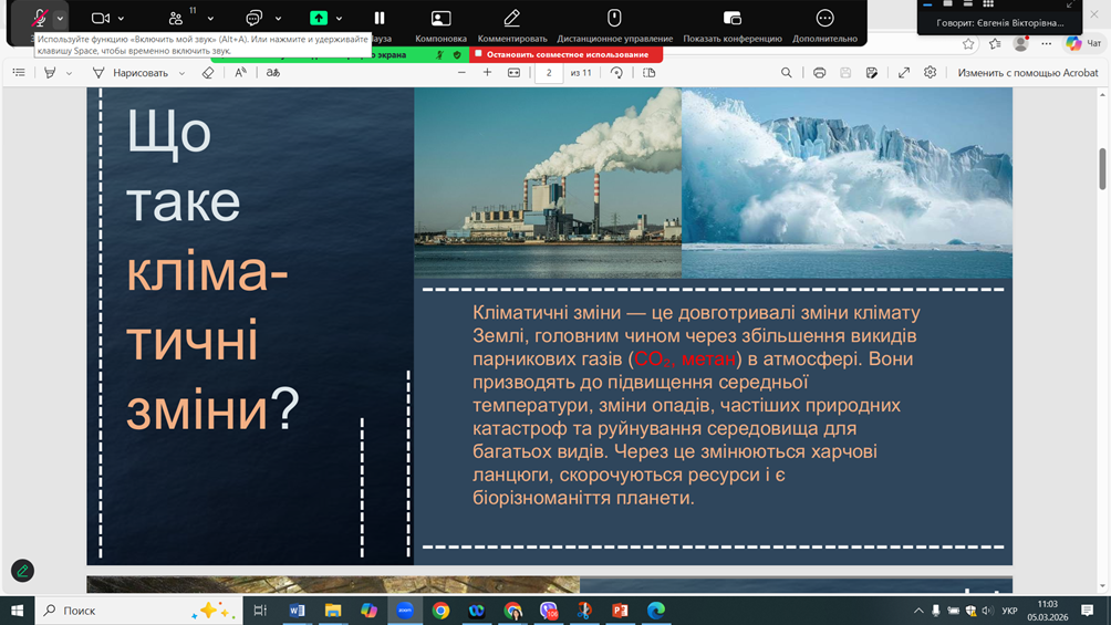 Студентка Євгенія Овдієнко представила доповідь на тему «Адаптація тварин до змін клімату». У своєму виступі вона розглянула основні механізми пристосування диких тварин до змін температурного режиму, трансформації природних середовищ існування та змін у кормовій базі. Доповідачка підкреслила, що зміни клімату суттєво впливають на міграційні процеси, поведінку та чисельність багатьох видів, що потребує посилення природоохоронних заходів та наукового моніторингу.