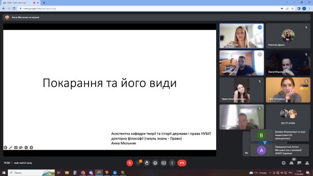 17 березня 2023 року відбулося чергове відкрите лекційне заняття, яке організувала кафедра теорії та історії держави і права. Асистентка кафедри, докторка філософії з права, практикуюча адвокатеса Анна Мельник розкрила тему «Покарання та його види» для студентів 2 курсу факультету землевпорядкування.