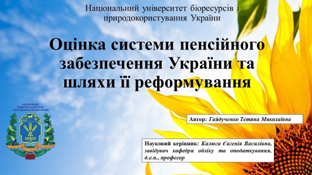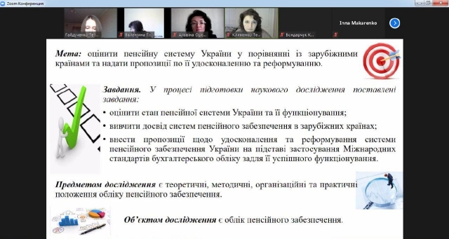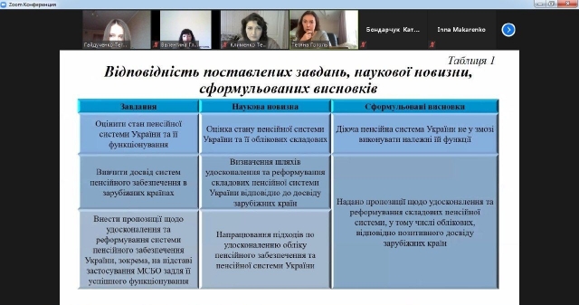 Національний університет біоресурсів і природокористування України був представлений науковими роботами: - Тетяни Гайдученко (здобувачки ОС «Магістр» 1 року навчання спеціальності 071 «Облік і оподаткування» освітньо-професіййної програми (ОПП) «Облік і аудит») на тему «Оцінка системи пенсійного забезпечення України та шляхи її реформування», науковий керівник – завідувач кафедри обліку та оподаткування Євгенія Калюга;