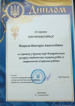 8) Перемога на конкурсі студентських наукових робіт зі спеціальності «Соціальна робота». Здобувачка магістерського рівня вищої освіти Мацола Вікторія (тема дослідної роботи «Соціально-психологічна реабілітація осіб, потерпілих від надзвичайних ситуацій засобами природотерапії») стала призеркою ІІ етапу Всеукраїнського конкурсу студентських наукових робіт, який проходив на базі Дрогобицького державного педагогічного університету імені Івана Франка.