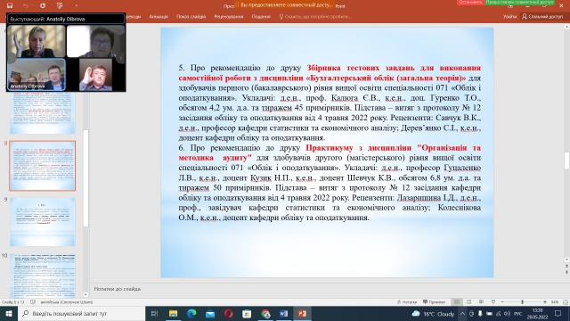 Голова вченої ради професор Діброва А.Д. розпочав роботу з порядку денного, в якому були питання: про атестацію аспірантів, присвоєння вчених звань, навчально-методичне забезпечення та інше. Про затвердження результатів атестації аспірантів факультету доповіла заступник декана з наукової роботи Негода Ю.В., яка зазначила що згідно наказу №232 була проведена атестація аспірантів. Гаранти освітньо-наукових програм PhD доктор філософії Байдала В.В., Давиденко Н.М., Гуцаленко Л.В., Ільчук М.М. прозвітували про стан атестації аспірантів в межах ОНП «Економіка підприємств та галузей національного господарства», «Облік і оподаткування», «Фінанси, банківська справа та страхування», «Підприємництво, торгівля та біржова діяльність». Рішенням вченої ради факультету було ухвалено атестувати аспірантів, які успішно відзвітували про проведену ними роботу.