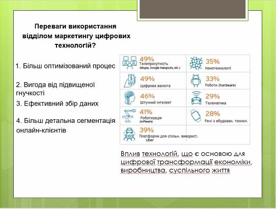 Під час викладення лекційного матеріалу було висвітлено питання зміни маркетингу цифровою революцією, представлено та проаналізовано разом зі студентами глобальні цифрові тренди до 2030 року. Лектором було чітко окреслено основні інструменти просування брендів в мережі Інтернет та визначено, що онлайн-маркетинг – це велика система каналів, якими маркетологи можуть просувати свої бренди.