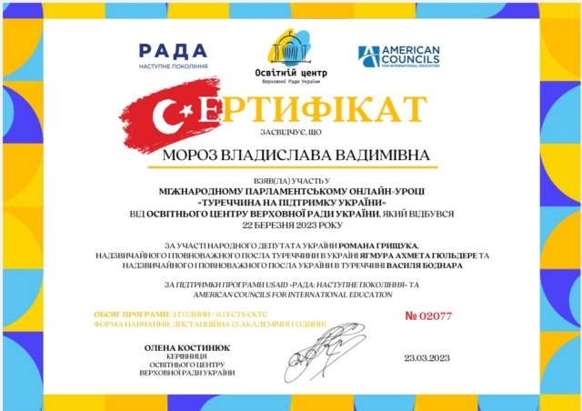 Студентка 4 курсу спеціальності «Міжнародні відносини, суспільні комунікації та регіональні студії» Владислава Мороз сьогодні відвідала парламентський урок «Туреччина на підтримку України». Який організувала команда освітнього центру Верховної Ради України.