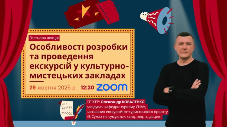 Лекцію провів експерт-практик: Олександр КОВАЛЕНКО, завідувач кафедри туризму Сумського національного аграрного університету, кандидат педагогічних наук, доцент та засновник відомого екскурсійного проєкту «В Сумах не сумують».