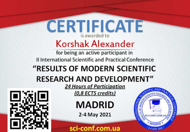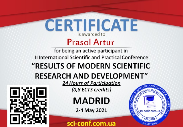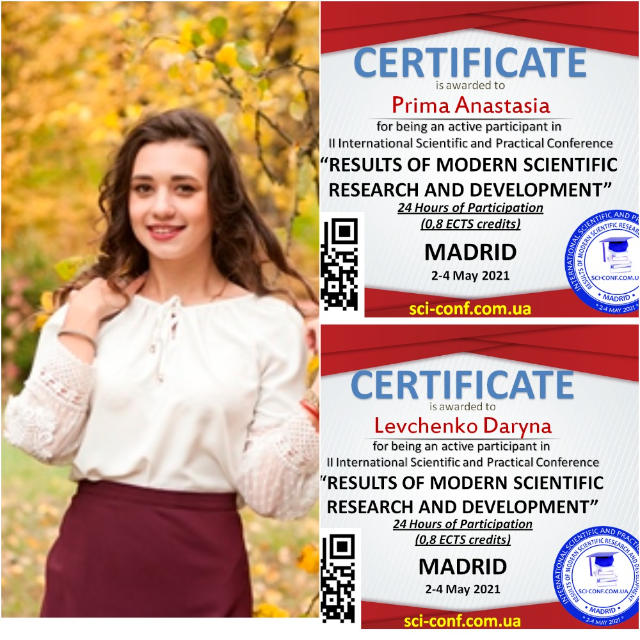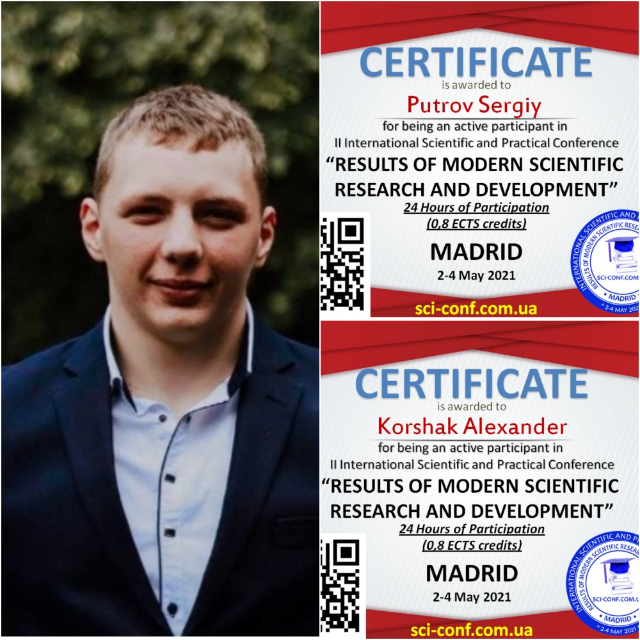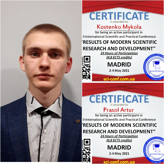 У місті Мадрид (Іспанія) 2-4 травня 2021 року відбулася ІІ Міжнародна науково-практична конференція «RESULTS OF MODERN SCIENTIFIC RESEARCH AND DEVELOPMEN», на якій Артур Прасол, Олександр Коршак та Дарина Левченко, студенти гуманітано-педагогічного факультету, спеціальності 017 «Фізична культура і спорт», гідно представили наш університет.