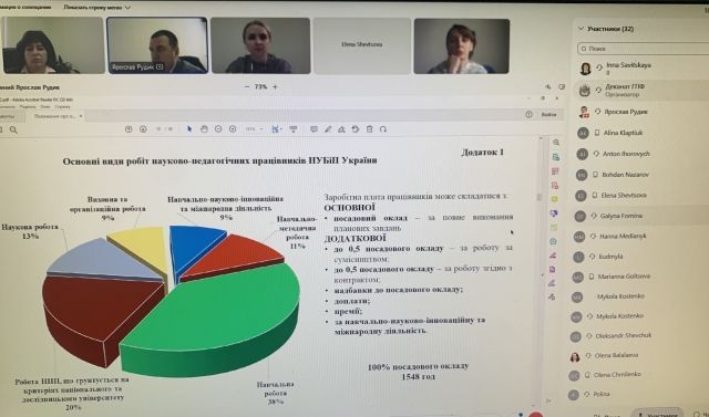 Секретар рейтингової комісії університету Ярослав Рудик ознайомив із загальною методикою планування та обліку роботи працівників, яка регулюється відповідним Положенням про планування та облік роботи науково-педагогічних працівників НУБіП України, затвердженим рішенням вченої ради університету від 27 травня 2022 р. Ярослав Михайлович окреслив пріоритетні напрями діяльності університету і зауважив, що саме ці пріоритети визначають основні види робіт НПП: навчальну, роботу, що ґрунтується на критеріях національного та дослідницького університету, наукову, навчально-науково-інноваційну, міжнародну, навчально-методичну, виховну й організаційну, їх планований обсяг, розподіл та часові нормативи.