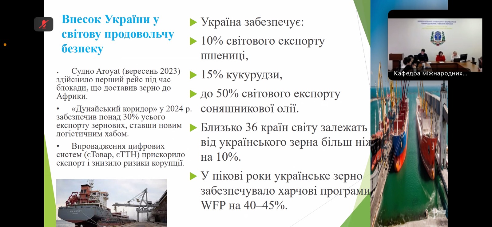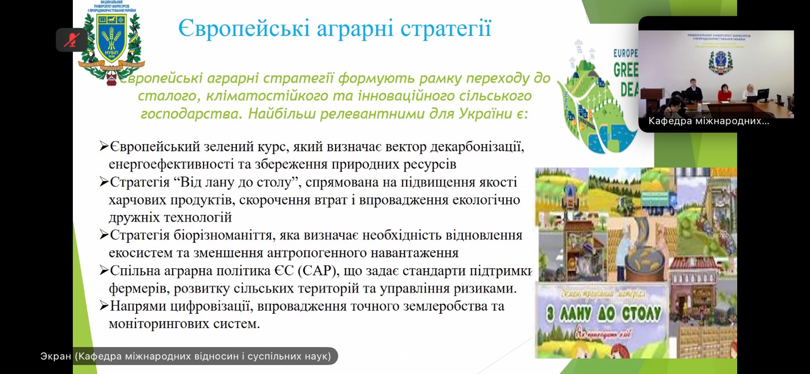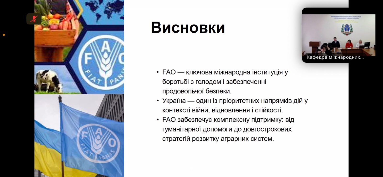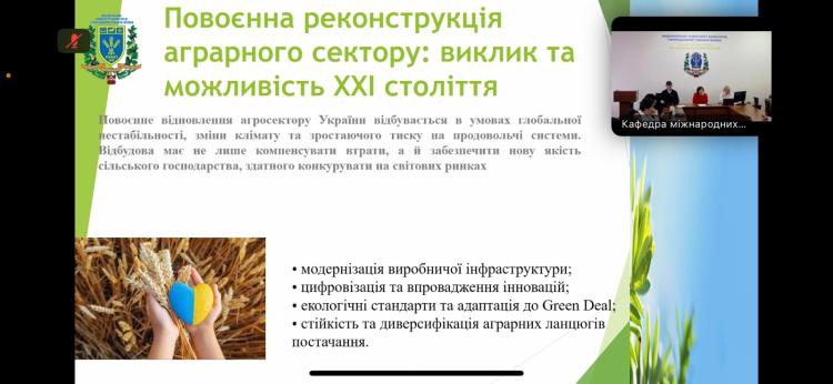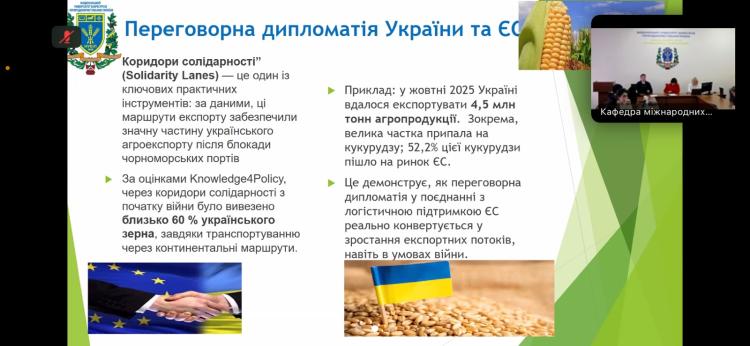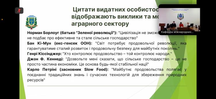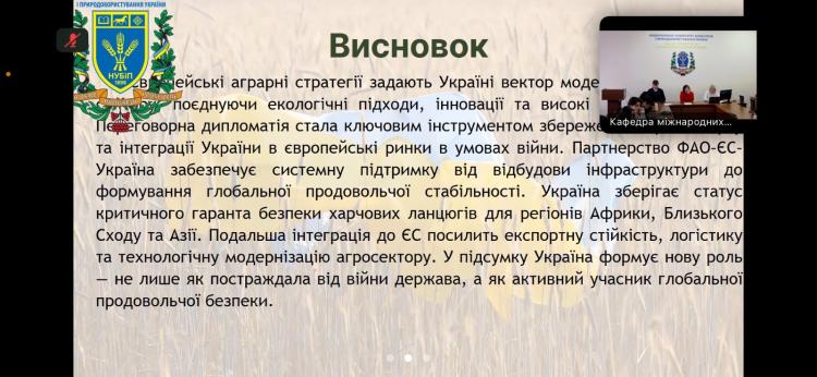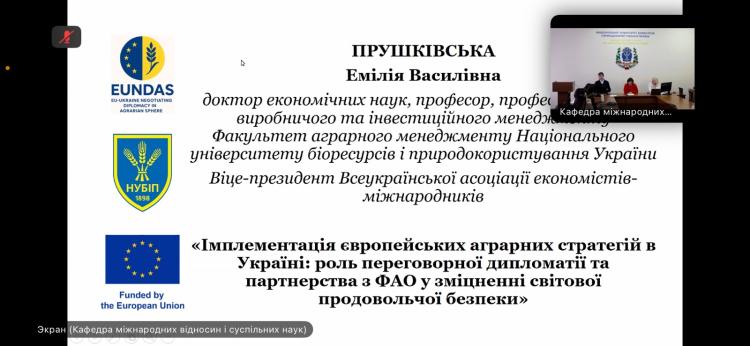 Учасники мали змогу зануритися в питання розвитку аграрної дипломатії, значення ФАО як ключової міжнародної організації у підтримці продовольчої безпеки та її внеску у розвиток аграрних систем у світі й в Україні. Ключову доповідь про імплементацію європейських аграрних стратегій в Україні представила доктор економічних наук, професор кафедри виробничого та інвестиційного менеджменту НУБіП України, віце-президент Всеукраїнської асоціації економістів-міжнародників Емілія Прушківська. Особливу увагу вона звернула на те, як переговорна дипломатія та партнерство з ФАО допомагають не лише підсилити національну стійкість, а й зробити вагомий внесок у зміцнення світової продовольчої безпеки. В її виступі прозвучали як історичні аспекти співпраці, так і сучасні виклики, з якими стикається Україна в умовах війни та післявоєнного відновлення.