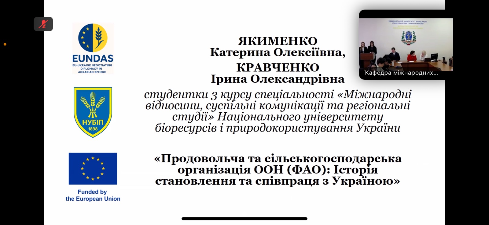 24 листопада 2025 року в НУБіП України відбувся насичений та змістовний круглий стіл на тему ролі ФАО в аграрній дипломатії держав Європи. Захід пройшов у межах проєкту Erasmus+ напряму Жана Монне «Переговорна дипломатія ЄС і України в аграрній сфері» (EUNDAS) і зібрав науковців, студентів та всіх, хто цікавиться міжнародною співпрацею у сфері продовольчої безпеки. Організатором заходу була член команди проєкту, доцент кафедри міжнародних відносин і суспільних наук Наталія Кравченко, а модератором виступив координатор проєкту, доцент кафедри міжнародних відносин і суспільних наук Богдан Грушецький. З вітальним словом до присутніх звернулася завідувач кафедри міжнародних відносин і суспільних наук Вікторія Хвіст.