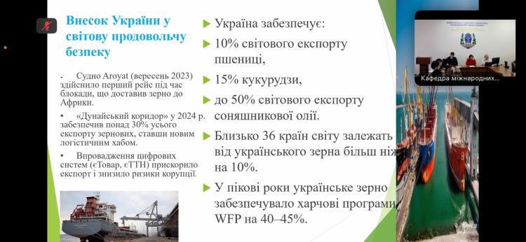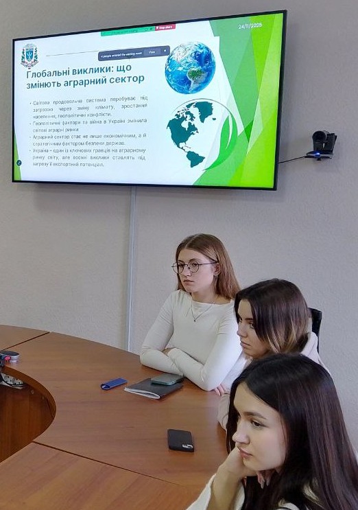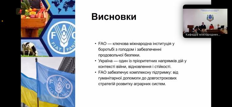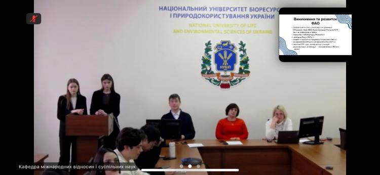 Важливою частиною круглого столу стали студентські виступи. Катерина Якименко та Ірина Кравченко, студентки 3 курсу спеціальності «Міжнародні відносини, суспільні комунікації та регіональні студії», презентували дослідження про історію створення ФАО, етапи її становлення та напрями взаємодії з Україною. Вони окреслили роль організації як нейтрального міжнародного майданчика для обговорення продовольчої політики, а також розповіли про ключові програми підтримки, які ФАО реалізує в Україні сьогодні.