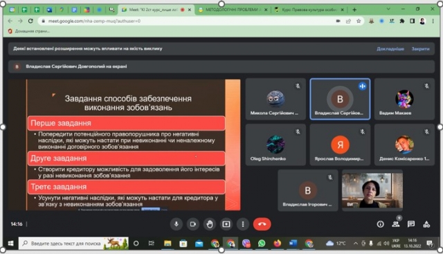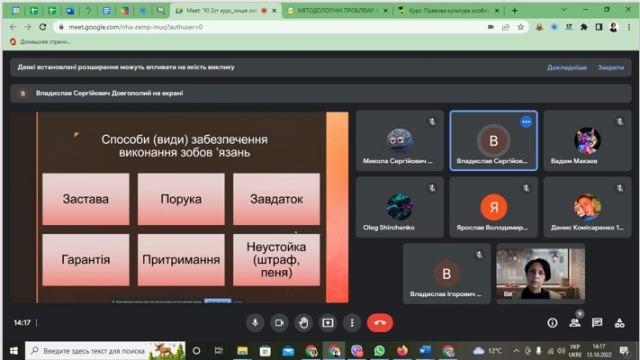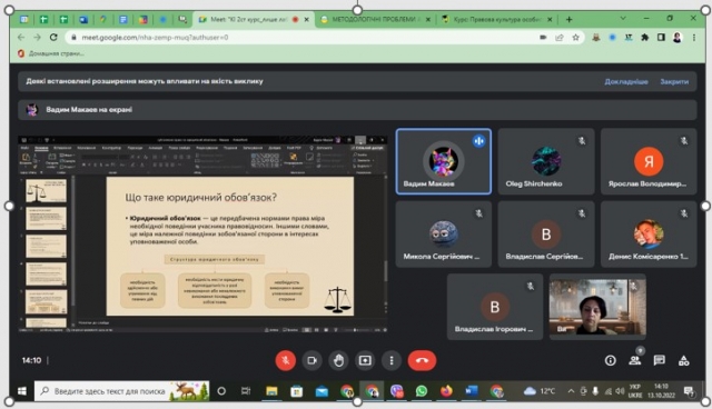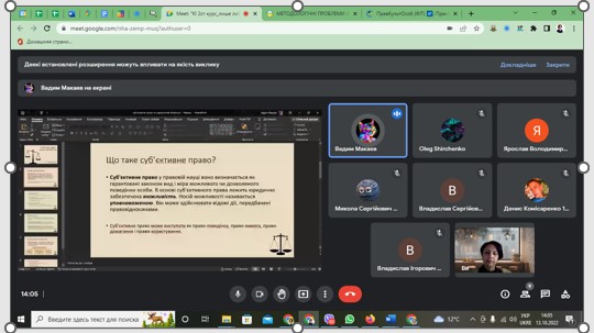 Під час засідання члени гуртка виступили з цікавими доповідями, і розповіли про результати своїх наукових пошуків. Що являє собою загалом суб’єктивне право. Потім дискусія плавно перейшла до обговорення юридичних обов’язків. Було вирішено що питанню основних прав та свобод варто буде приділити увагу на одному з наступних засідань, оскільки їх перелік не є вичерпним і потребує окремого огляду збоку членів гуртка.