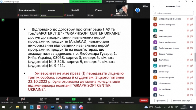 25 жовтня 2022 року о 13:30 на базі факультету архітектури, будівництва та дизайну Національного авіаційного університету відбувся міжвузівський розширений навчально-практичний семінар на тему: «ArchiCAD – використання цифрових інструментів у навчанні”.